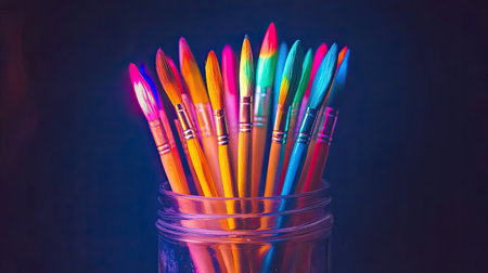 A stunning collection of vibrant paintbrushes displayed in a clear jar, set against a dark background, perfect for showcasing artistic creativity and inspiration.