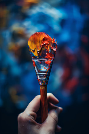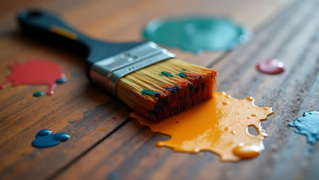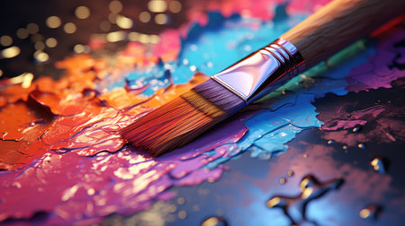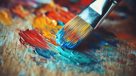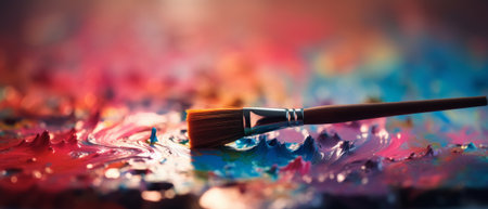A closeup of vibrant paintbrushes dripping colorful paint onto a surface, showcasing the beauty of artistic expression and creativity through vivid hues and textures.