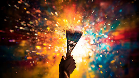 Bright paint splashes cover a palette, while a brush strokes vibrant colors on a canvas, embodying artistic creativity in action. Generative AI