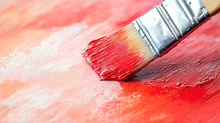 Paint brush with red paint on a textured red background.