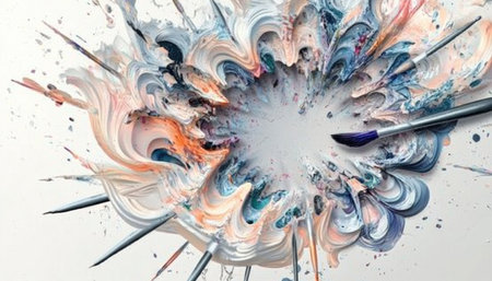 A vibrant abstract painting in progress with paintbrushes adding lively colors