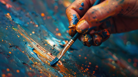 Close-up of artist's hand holding brush and painting abstract background