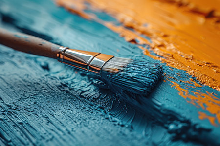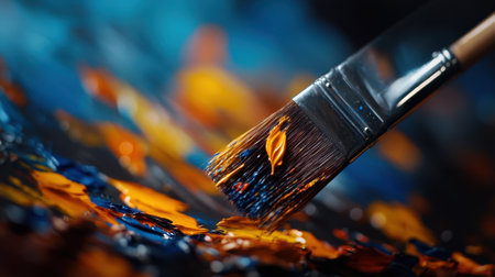 A paintbrush is dipped into a blue and orange paint. The brush is being used to paint a picture