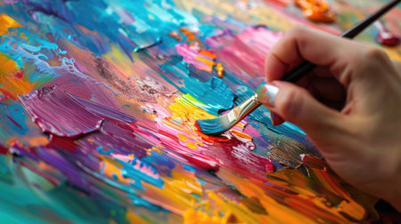 A close-up view of a hand applying bright paint with a brush on a colorful abstract canvas, showcasing vivid textures and artistic creativity.