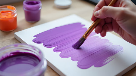Close-up of a female hand painting purple nail polish on a white sheet of paper