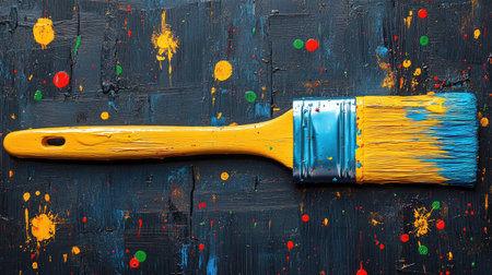 A paintbrush with blue bristles, holding yellow and orange paint, creating vibrant color splashes on a dark navy background. High-quality photograph. Studio lighting. Minimalist stock photography style. The brush is placed at the bottom right of an isolated canvas, with scattered colorful dots representing different colors being applied --chaos 30 --ar 16:9 --stylize 500 --v 6.1 Job ID: 59606c15-0c32-40f8-ade1-3fab8adca5b7