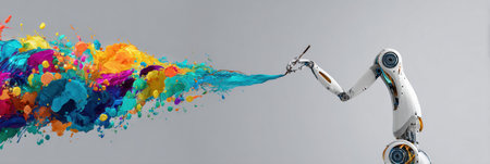 A robotic arm skillfully disperses vibrant paint colors on a neutral background, showing creativity and technology.