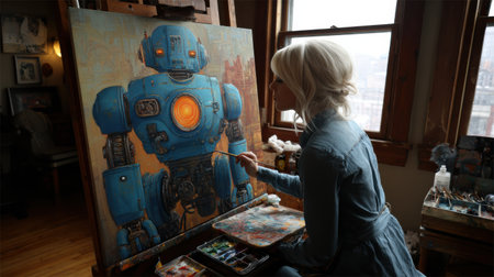 An artist is focused on creating a colorful painting of a blue robot with an orange light in a sunny studio.