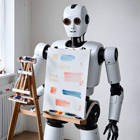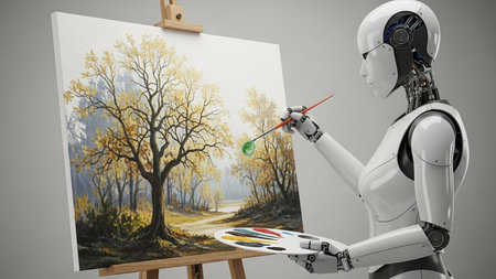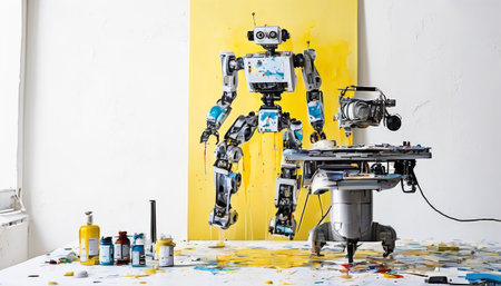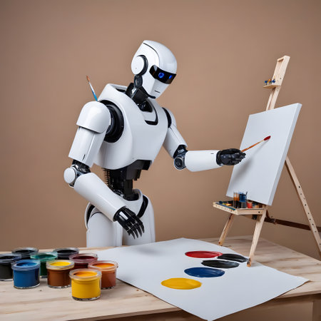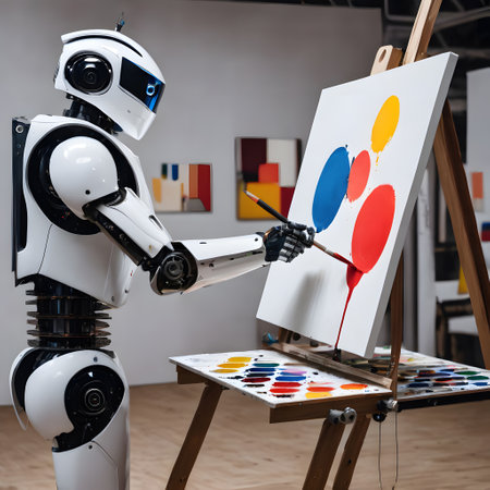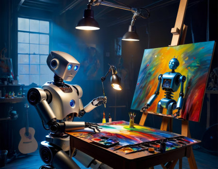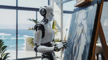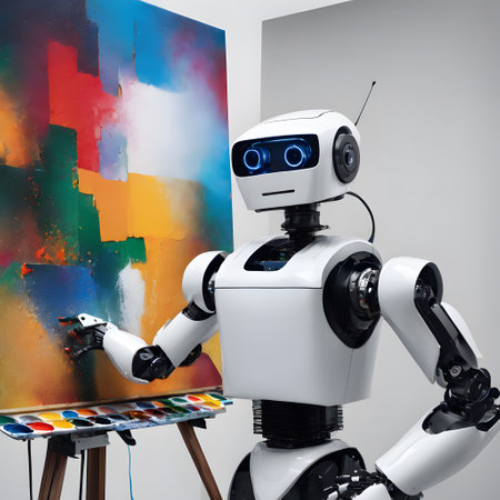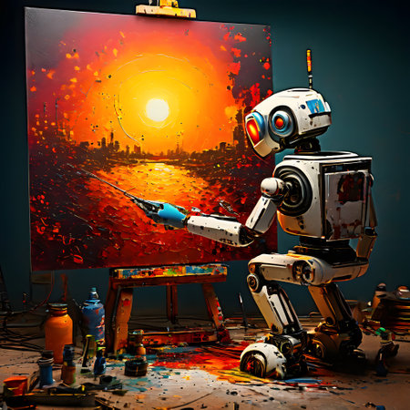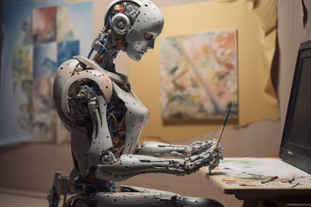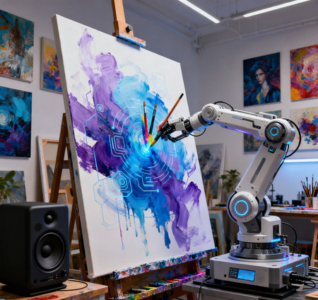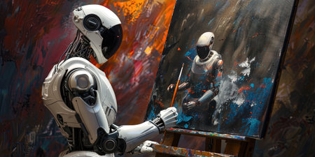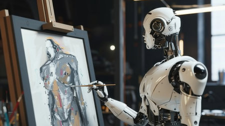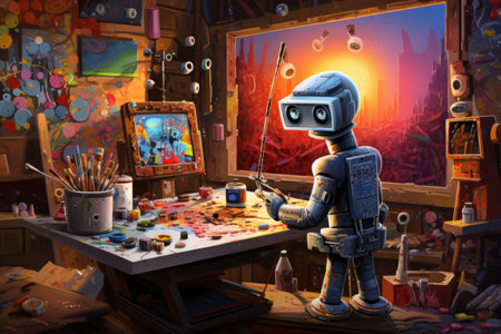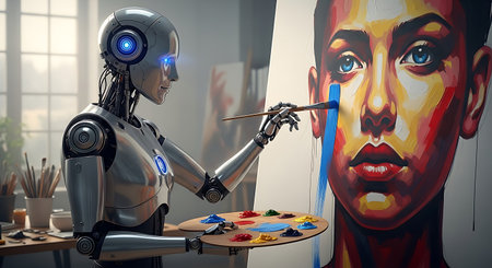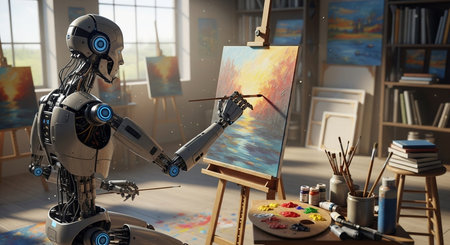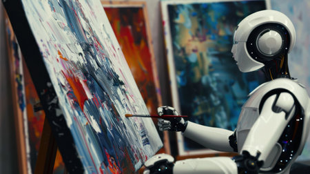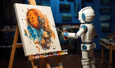 Artificial intelligence robot working on a painting in an art studio.
