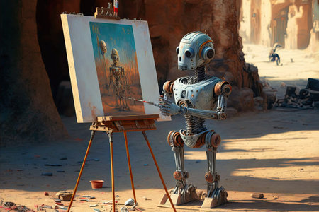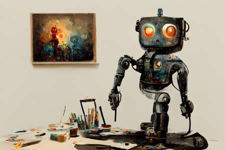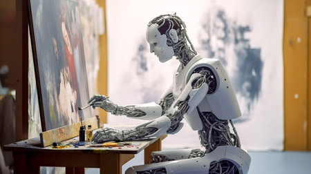 Painter robot painting a picture using Artificial Intelligence. Concept of AI using machine learning to generate artwork based on previously learned styles and generate creative images from text.