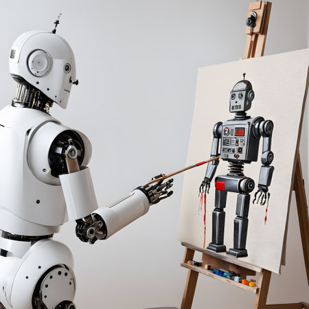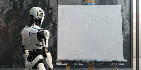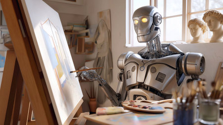 A futuristic robot creates a self-portrait at an easel in a bright studio.
