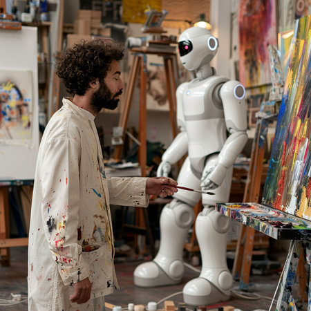 A robotic hand assists a human artist in a vibrant studio, showcasing the intersection of technology and creativity in the world of art.