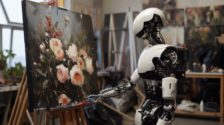 Artificial intelligence robot working on a painting in an artist's studio