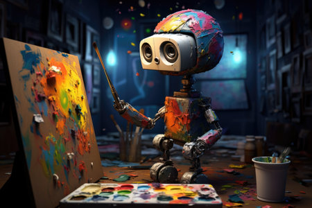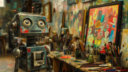 Robot with a paintbrush, capturing the blend of technology and traditional art in a creative scene.