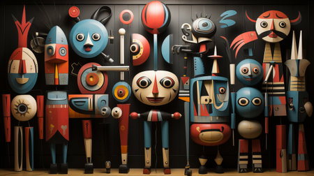A whimsical collection of vibrant cartoon sculptures playfully bounce and twist within an indoor art exhibit, radiating a contagious sense of joy and imagination