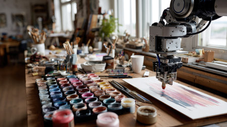 A robotic arm carefully creates a unique piece of art in a vibrant artist studio. Colorful jars of paint and brushes surround the workspace, reflecting creativity.
