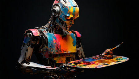 Colorful robot painting on a palette in a dark studio