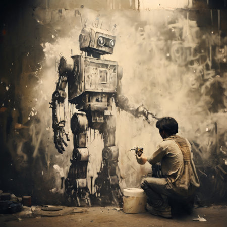 Artist painting a large robot on a grunge wall