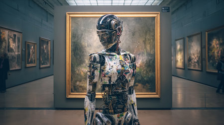A robot stands in front of a piece of art, analyzing it with its cameras and sensors. The robot appears focused and interested in the artwork, possibly studying its details and composition.