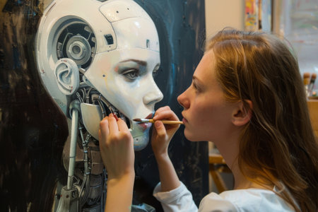 A cybernetic artist, adorned with intricate circuits, is meticulously painting a colorful masterpiece. The scene reflects a blend of human-like creativity and advanced technology.. AI Generation