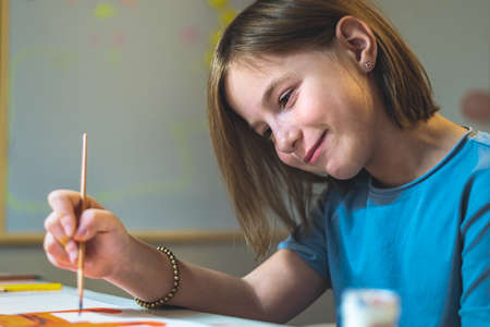 cute girl at home at the table draws with paints