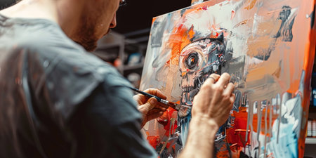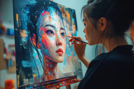 A young artist focuses on painting a colorful portrait of a woman in an art studio. The room is filled with various art supplies and bright hues reflecting creativity.