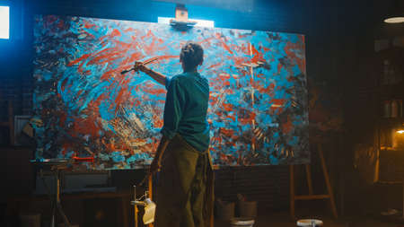 Talented Female Artist Works on Abstract Oil Painting, Using Paint Brush She Creates Modern Masterpiece. Dark and Messy Creative Studio where Large Canvas Stands on Easel Illuminated.