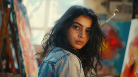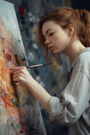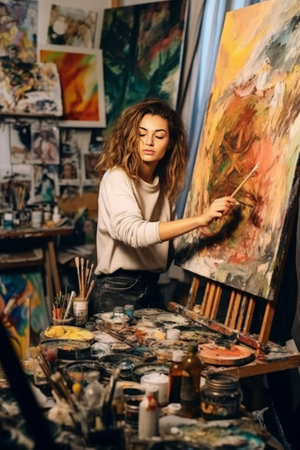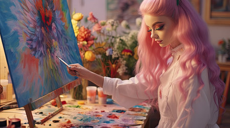 A woman art director is painting in her studio in the vibrant airy scenes. Generative AI AIG21.