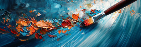 Closeup Of Brush Applying Vibrant Orange And Blue Paint To Abstract Artwork, Creative Art Background