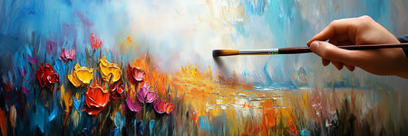 Artist s Hand With Brush Creates Colorful Landscape On Canvas, Abstract Artistic Background