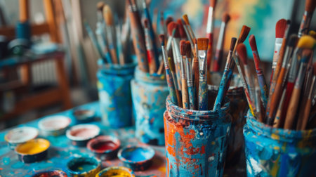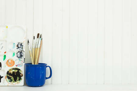 Artist supplies at abdtract table. Paint brush in clay jug and art painter tools on desk background texture. Paintbrush for painting in artist workplace