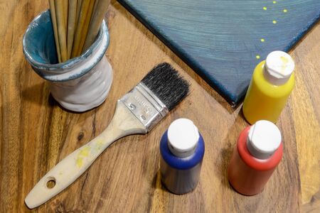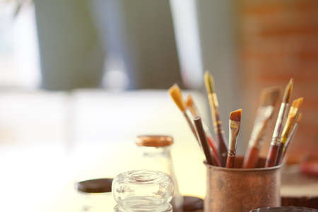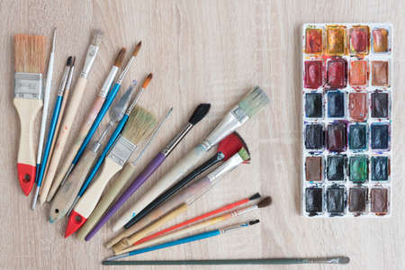 Paint brushes and watercolor paints on the table in a workshop, selective focus, close up.