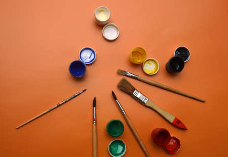 Open jars with gouache and paint brushes of different sizes. The view from the top. Background, texture. The concept of space for creativity
