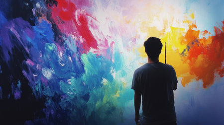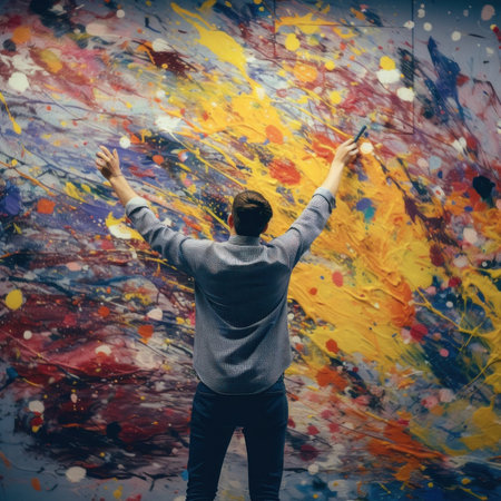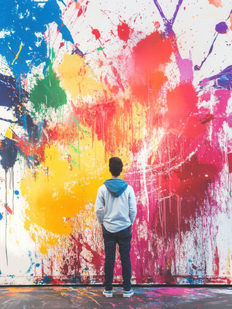 A passionate artist stands before a large canvas adorned with vibrant paint splashes, embodying the essence of creative energy and inspiration.