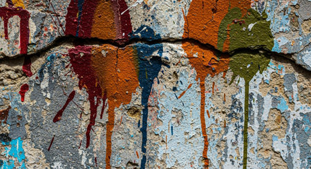 An abstract textured wall with peeling paint in red, teal, and white splatters and drips.