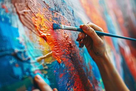 Close-up of a person's hands skillfully painting a textured design onto a wall. The vibrant colors contrast visually.