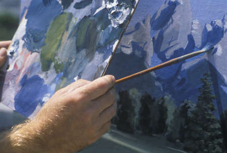 Artist holds brush and paints picture on canvas. Contemporary creativity concept