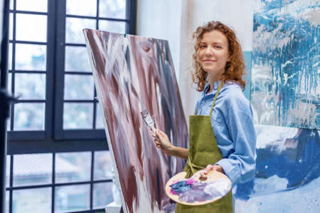 Creative painter in working process. Artist workplace, hobby, craft tools. Artist female canvas painting. Professional young woman painter draws in the workshop. Leisure activity. Art at home