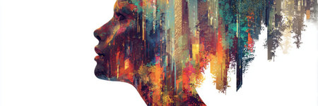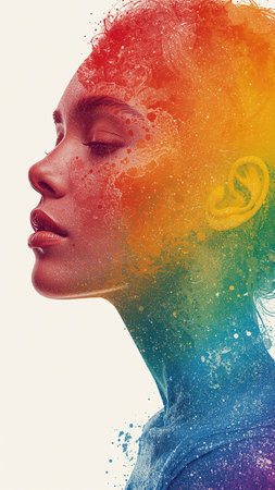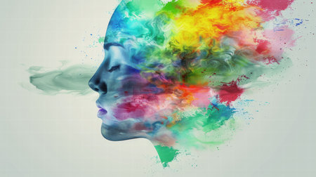 A stunning silhouette of a side profile dissolving into colorful splatters and patterns against a light background, representing creativity, identity, and transformation.