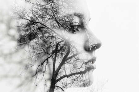 Artistic black and white double exposure of a woman's profile with tree branches