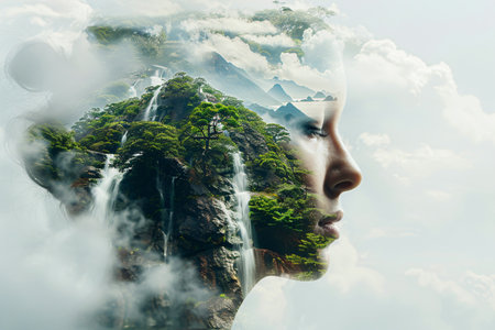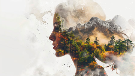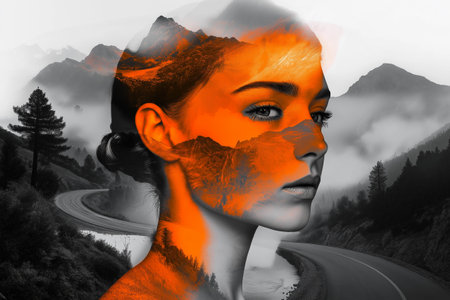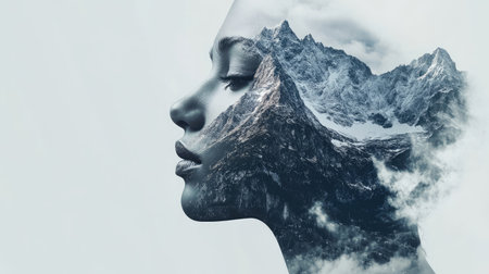 a creative double exposure where the silhouette of a woman's face is superimposed on a mountainous landscape, blending the natural world with human elements in an artistic manner