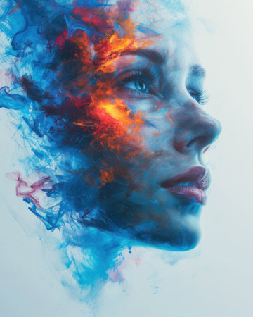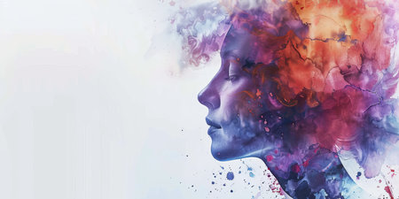 Abstract portrait of female profile in vibrant paint splatters.
