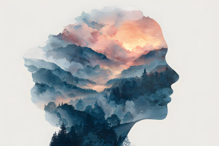 A serene silhouette of a person features a blend of watercolors depicting mountains and sky. Soft pastel colors create a peaceful sunset scene, evoking tranquility and introspection.