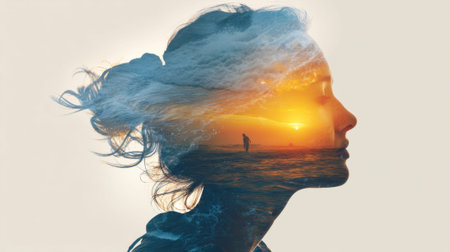 A double exposure featuring a womans face overlaid with a sunset in the background. The sun setting on the horizon blends with the contours of the womans face, creating a unique and artistic effect.