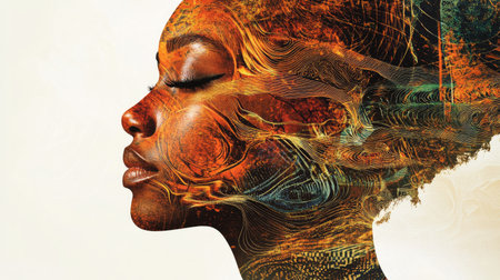 Double exposure of a face merging with organic patterns and earthy hues, symbolizing connection to the land