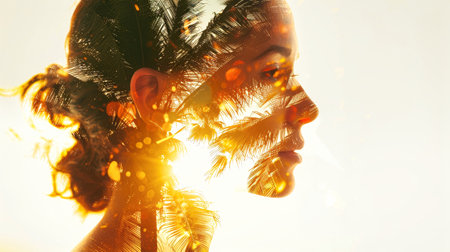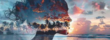 A womans silhouette is overlaid with a palm tree and a colorful sunset, creating a beautiful and evocative image of the tropics.