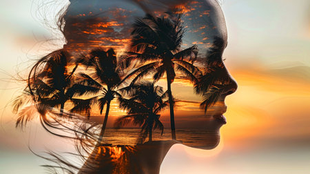 A womans silhouette is merged with palm trees, creating a dreamy image of a sunset on the beach.