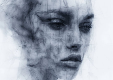 A monochrome abstract geometrical paintography portrait of a young woman profile with sun glasses