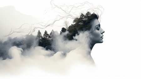 a personalistic female portrait, inspired by smoke and forest, captured by kahlia pellet. this captivating image showcases isolated landscapes and flowing silhouettes, with a touch of double exposure. the detailed skies and naturalistic renderings add depth to the high-resolution photograph, reminiscent of the artistic style of dusan djukaric. ai generated