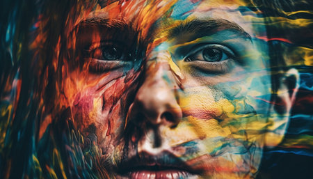 Colorful portrait of a woman with artistic face paint and vibrant splashes of color around her. Creative beauty and self-expression concept.